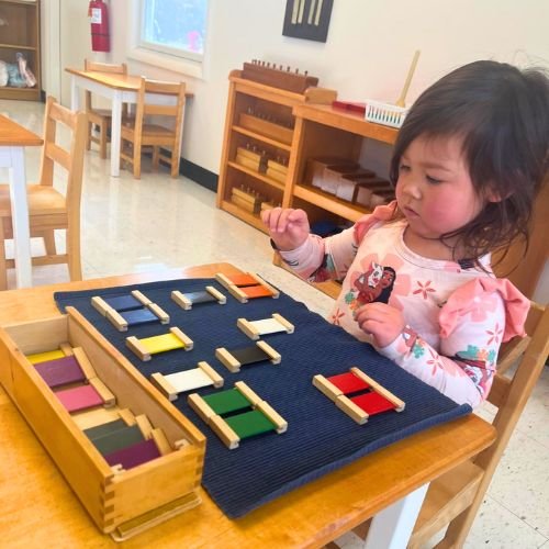 Children explore and make sense of their world through beautifully designed Montessori materials that engage all five senses. Through matching, sorting, and classifying objects by size, shape, color, texture, and scent, they refine observation, discrimination, and reasoning skills, transforming hands-on discovery into a strong foundation for abstract thinking. By actively using their senses to touch, compare, and differentiate materials, children gain clarity through direct experience. Purposeful sensory activities, including geometric and mathematical dimensional materials, further support the development of visual perception, spatial awareness, and early analytical thinking